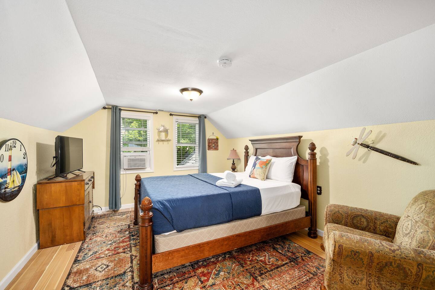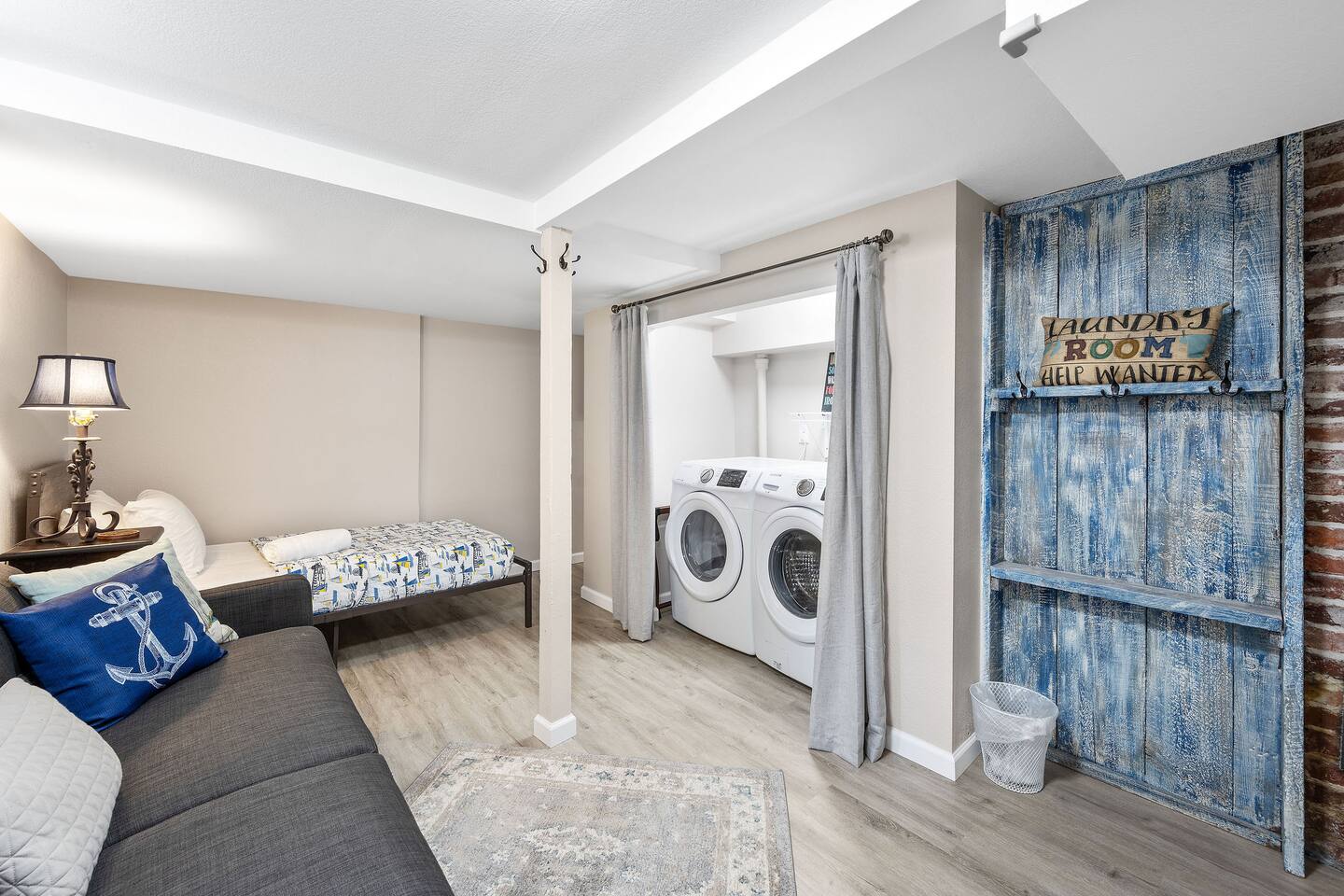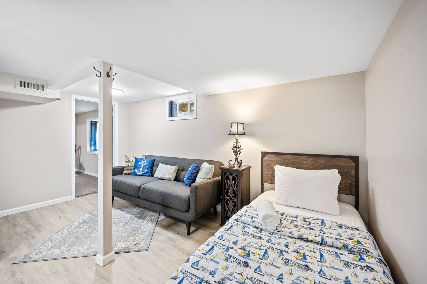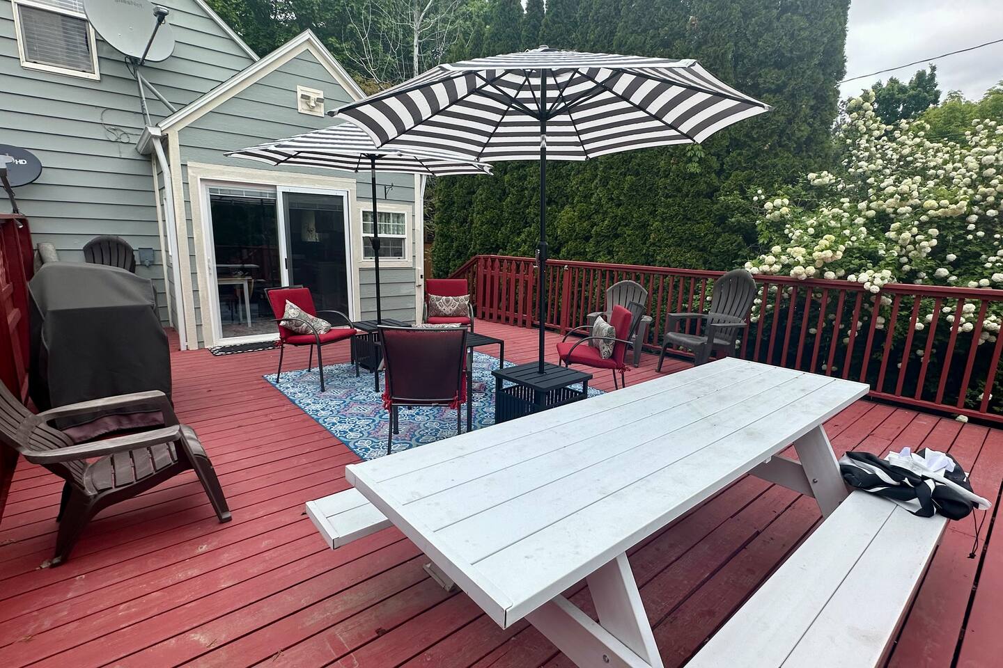 The main level has a fully enclosed entrance with benches where you can comfortably remove your shoes. Then you enter into the open floor plan, starting with the Family Room where you'll have comfortable seating and a Smart TV to stream all your shows. Just past the family room you'll see the full kitchen with the original 1938 wood floors, plenty of cabinets and a table that can seat 8, plus a glass slider door that takes you out to an open, private deck with umbrellas, a table, seating and a BBQ. In addition to the kitchen you'll find the stairs to the upstairs bedroom, basement, as well as the hall to the 2 main floor bedrooms and a full bathroom. Both bedrooms have closet space and the bathroom is conveniently between the bedrooms. Upstairs you'll find another bedroom with a queen bed and Smart TV for watching, as well as a storage area with extra sheets, pillow and blankets you may need during your stay. The newly remodeled basement has a bedroom with a single bed attached to a bathroom with a standup shower, closet space and a smart tv. The laundry room provides a full size washer/dryer as well as a cozy seating area and another single bed for more sleeping options. You can also enter the basement directly from the driveway. Outside of the home the front and back yards are fully fenced, quiet and peaceful. The back deck is private and a beautiful area to enjoy the sun during the day and stars at night.