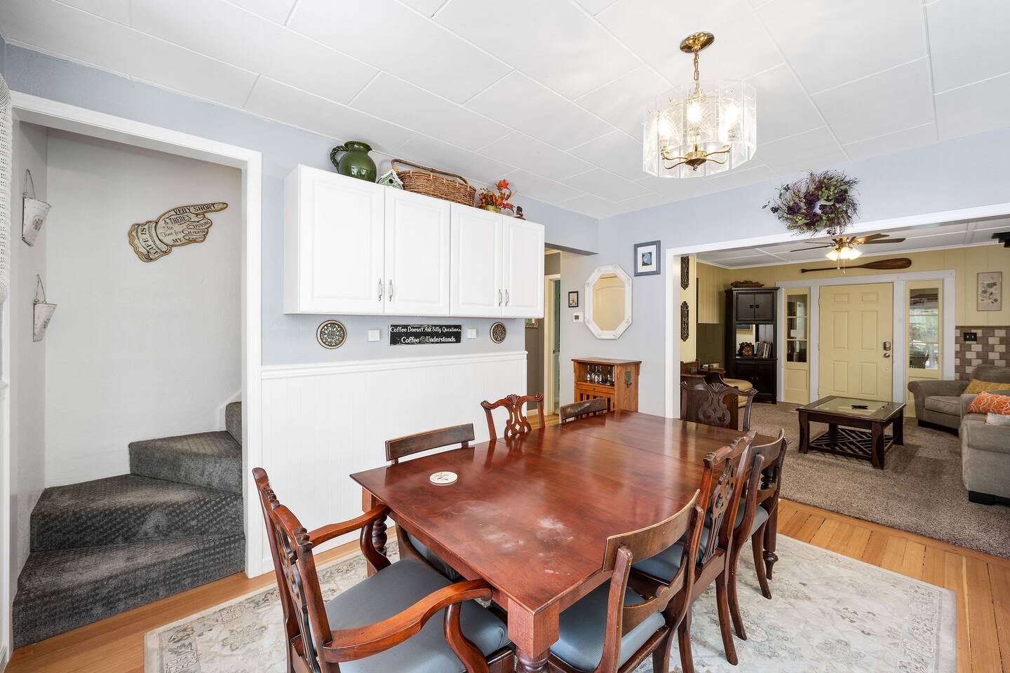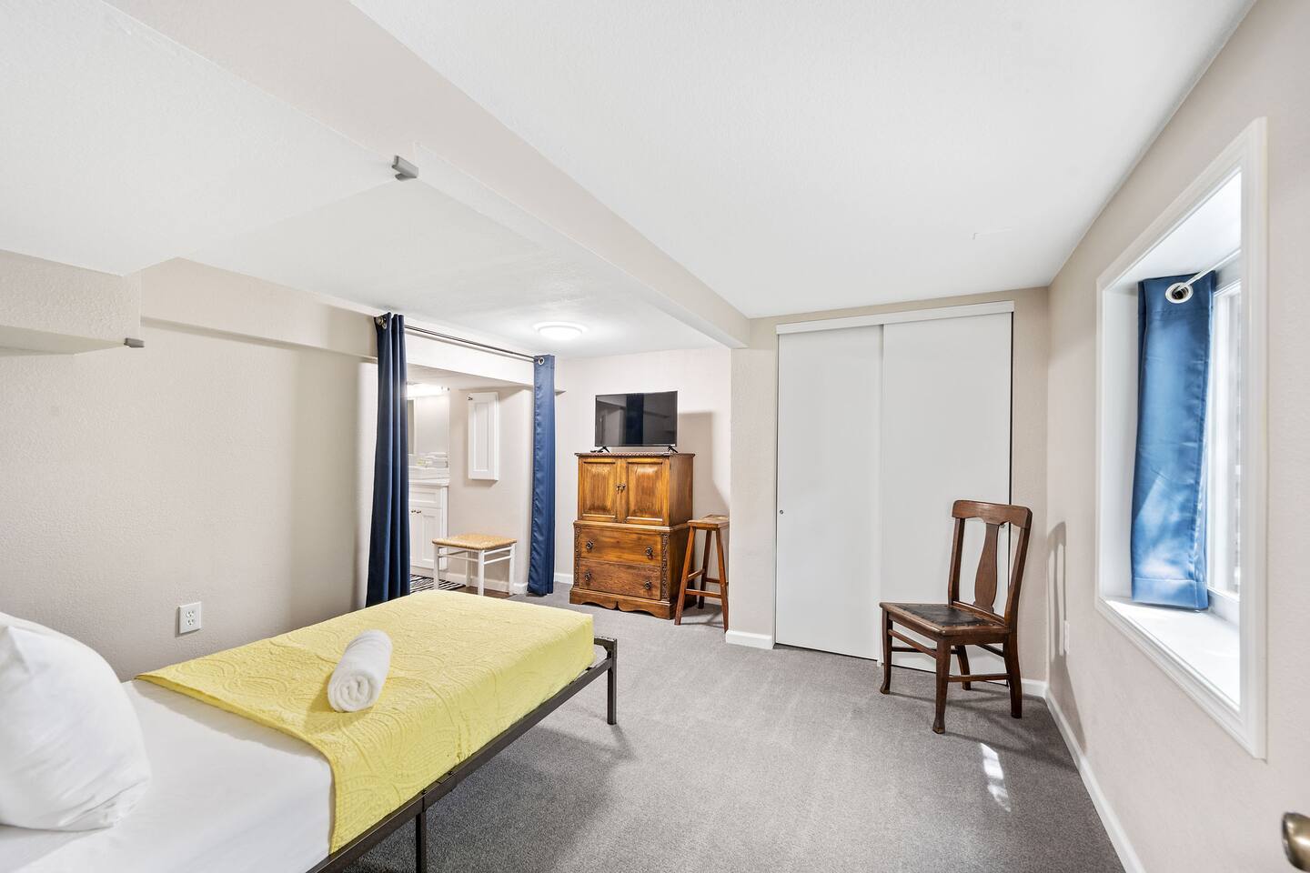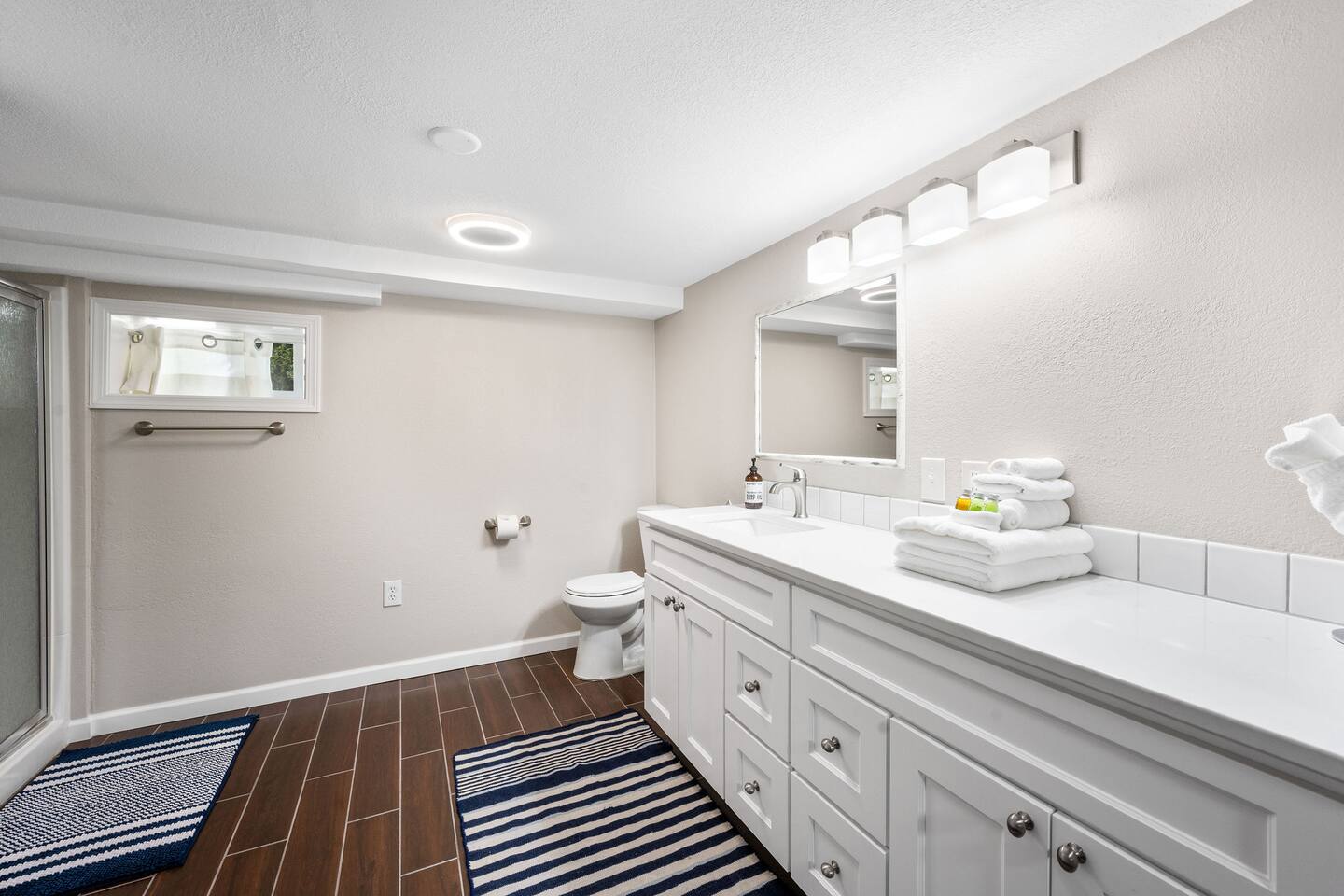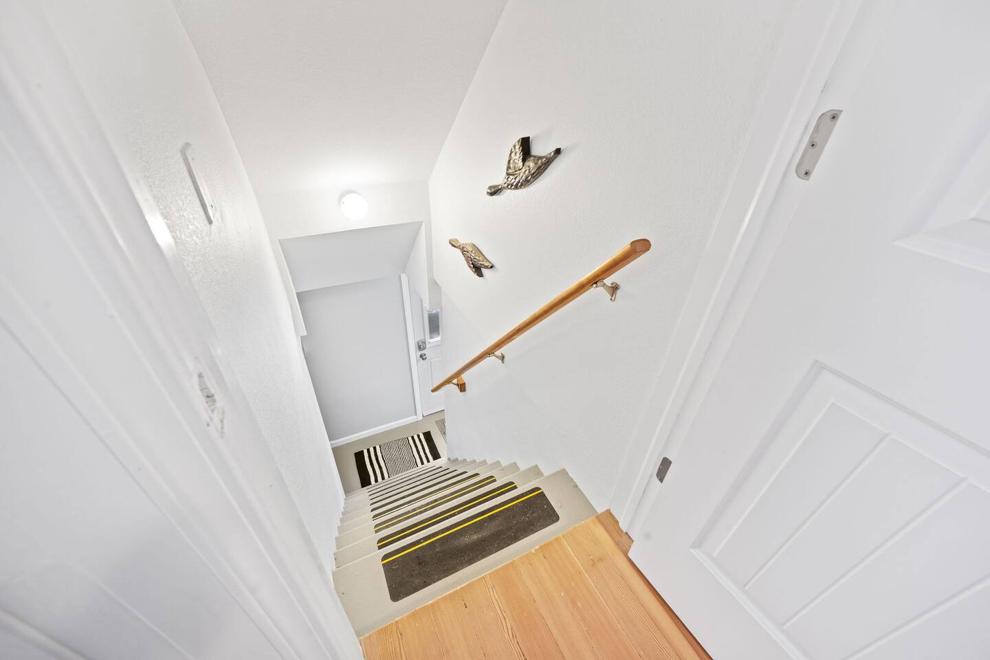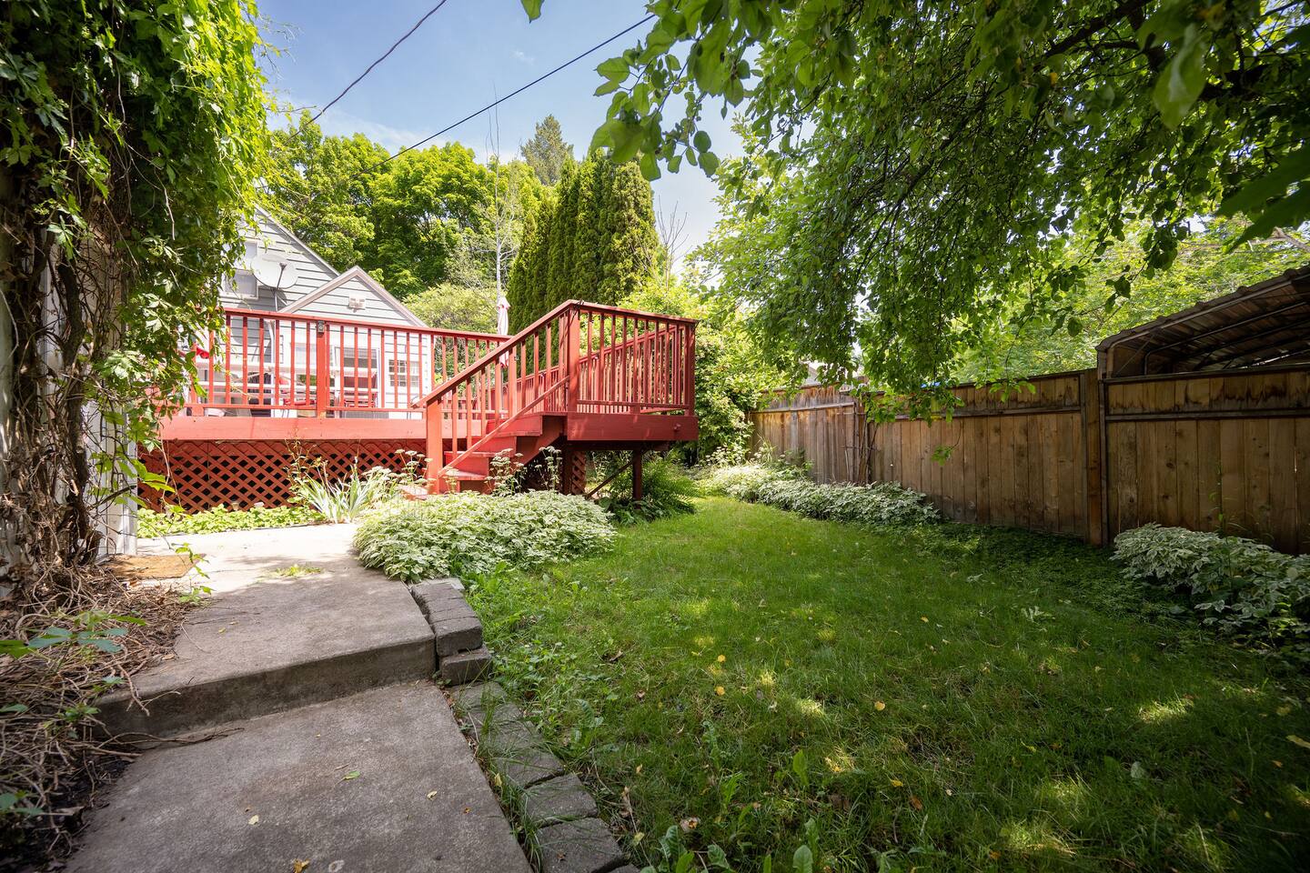 The main level has a fully enclosed entrance with benches where you can comfortably remove your shoes. Then you enter into the open floor plan, starting with the Family Room where you'll have comfortable seating and a Smart TV to stream all your shows. Just past the family room you'll see the full kitchen with the original 1938 wood floors, plenty of cabinets and a table that can seat 8, plus a glass slider door that takes you out to an open, private deck with umbrellas, a table, seating and a BBQ. In addition to the kitchen you'll find the stairs to the upstairs bedroom, basement, as well as the hall to the 2 main floor bedrooms and a full bathroom. Both bedrooms have closet space and the bathroom is conveniently between the bedrooms. Upstairs you'll find another bedroom with a queen bed and Smart TV for watching, as well as a storage area with extra sheets, pillow and blankets you may need during your stay. The newly remodeled basement has a bedroom with a single bed attached to a bathroom with a standup shower, closet space and a smart tv. The laundry room provides a full size washer/dryer as well as a cozy seating area and another single bed for more sleeping options. You can also enter the basement directly from the driveway. Outside of the home the front and back yards are fully fenced, quiet and peaceful. The back deck is private and a beautiful area to enjoy the sun during the day and stars at night.