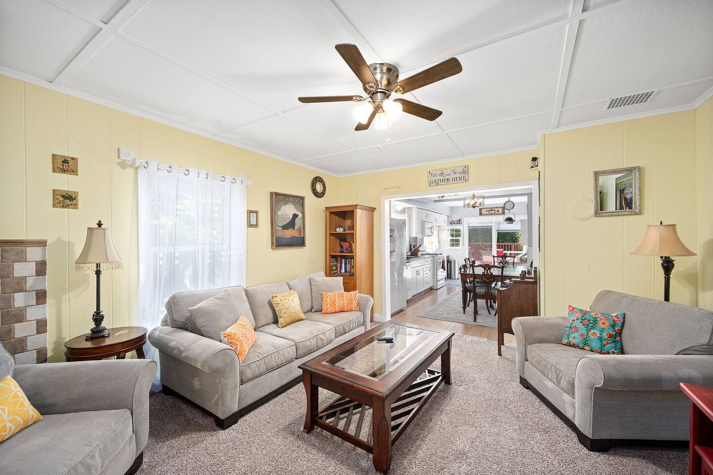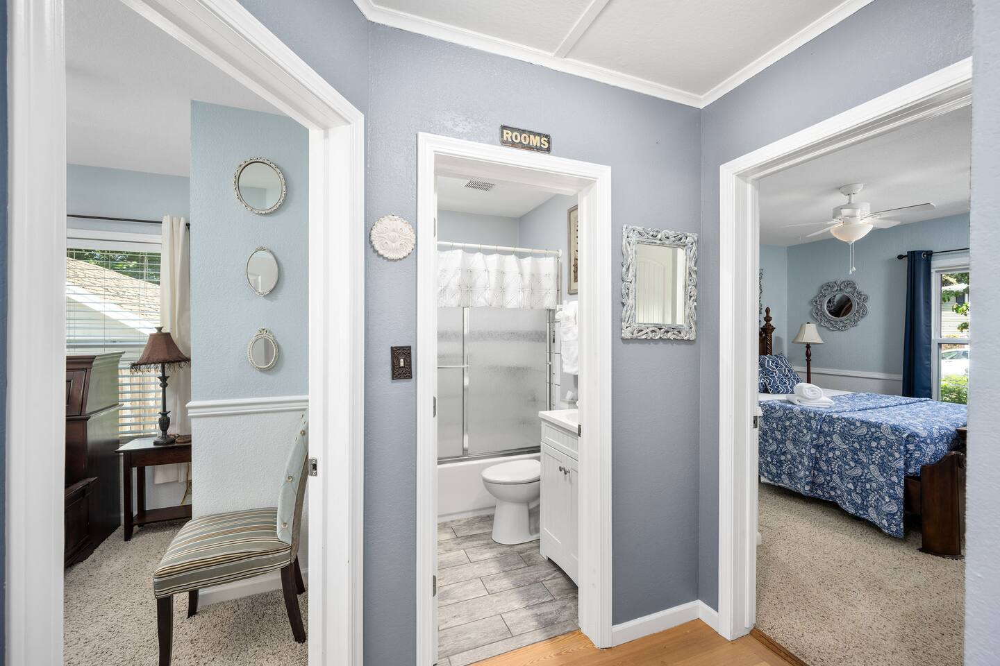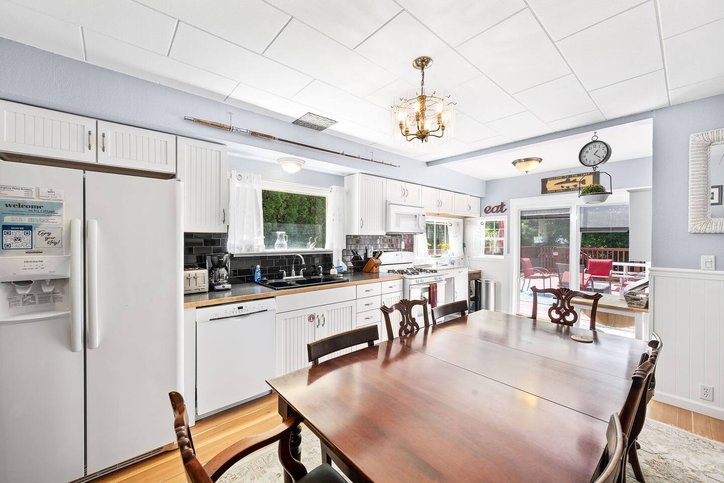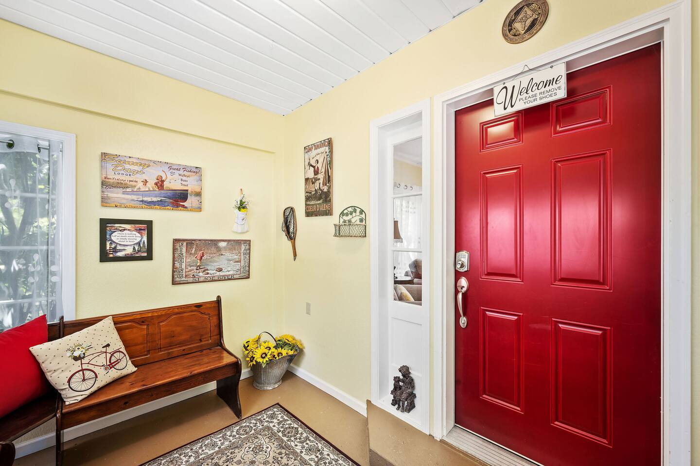 The main level has a fully enclosed entrance with benches where you can comfortably remove your shoes. Then you enter into the open floor plan, starting with the Family Room where you'll have comfortable seating and a Smart TV to stream all your shows. Just past the family room you'll see the full kitchen with the original 1938 wood floors, plenty of cabinets and a table that can seat 8, plus a glass slider door that takes you out to an open, private deck with umbrellas, a table, seating and a BBQ. In addition to the kitchen you'll find the stairs to the upstairs bedroom, basement, as well as the hall to the 2 main floor bedrooms and a full bathroom. Both bedrooms have closet space and the bathroom is conveniently between the bedrooms. Upstairs you'll find another bedroom with a queen bed and Smart TV for watching, as well as a storage area with extra sheets, pillow and blankets you may need during your stay. The newly remodeled basement has a bedroom with a single bed attached to a bathroom with a standup shower, closet space and a smart tv. The laundry room provides a full size washer/dryer as well as a cozy seating area and another single bed for more sleeping options. You can also enter the basement directly from the driveway. Outside of the home the front and back yards are fully fenced, quiet and peaceful. The back deck is private and a beautiful area to enjoy the sun during the day and stars at night.